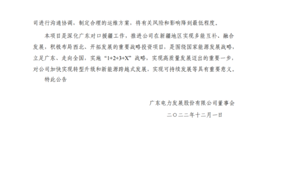 廣東電力表示,本項(xiàng)目是深化廣東對(duì)口援疆工作,推進(jìn)公司在新疆地區(qū)實(shí)現(xiàn)多能互補(bǔ)、融合發(fā)展,積極布局西北、開(kāi)拓發(fā)展的重要戰(zhàn)略投資項(xiàng)目,是圍繞國(guó)家能源發(fā)展戰(zhàn)略,立足廣東、走向全國(guó),實(shí)施“1+2+3+X”戰(zhàn)略,實(shí)現(xiàn)高質(zhì)量發(fā)展邁出的重要一步,對(duì)公司加快實(shí)現(xiàn)轉(zhuǎn)型升級(jí)和新能源跨越式發(fā)展,實(shí)現(xiàn)可持續(xù)發(fā)展等具有重要意義。