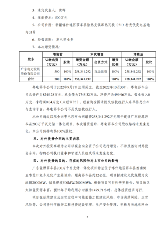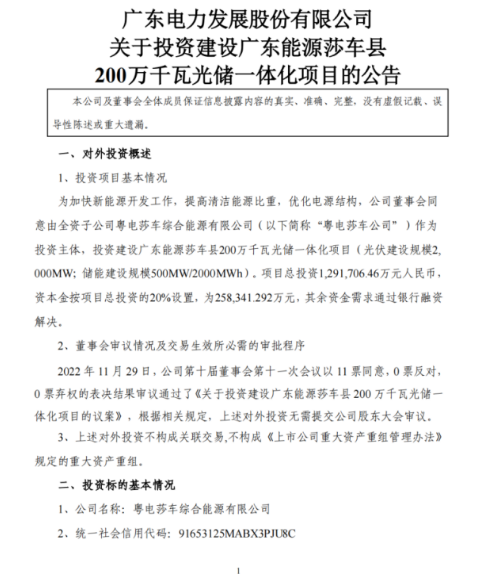 12月1日,廣東電力發(fā)布《關(guān)于投資建設(shè)廣東能源莎車縣200萬(wàn)千瓦光儲(chǔ)一體化項(xiàng)目》的公告,公告稱,為加快新能源開(kāi)發(fā)工作,提高清潔能源比重,優(yōu)化電源結(jié)構(gòu),公司董事會(huì)同意由全資子公司粵電莎車綜合能源有限公司(以下簡(jiǎn)稱“粵電莎車公司”)作為投資主體,投資建設(shè)廣東能源莎車縣200萬(wàn)千瓦光儲(chǔ)一體化項(xiàng)目。項(xiàng)目總投資1,291,706.46萬(wàn)元人民幣。