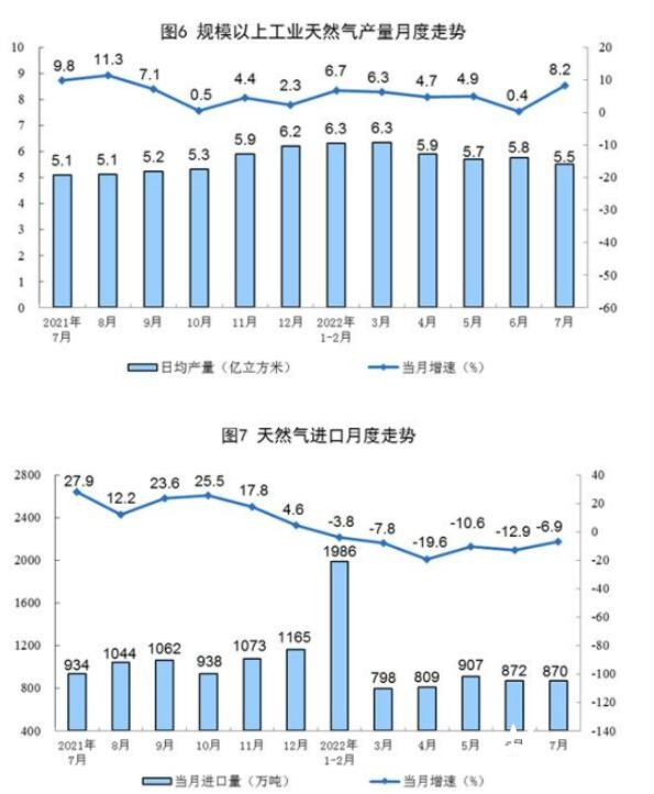 1—7月份,生產(chǎn)天然氣1267億立方米,同比增長5.4%。進口天然氣6221萬噸,同比下降9.6%。