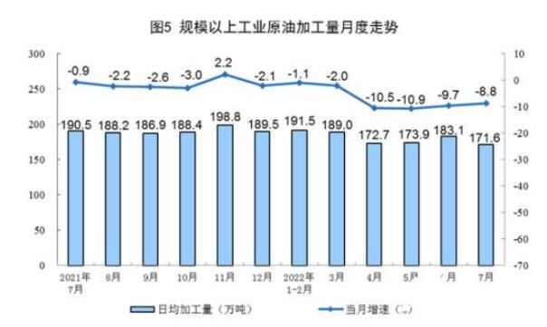 原油生產(chǎn)穩(wěn)定增長,進口降幅略有收窄。7月份,生產(chǎn)原油1713萬噸,同比增長3.0%,增速比上月放緩0.6個百分點,日均產(chǎn)量55.2萬噸。進口原油3733萬噸,同比下降9.5%,降幅比上月收窄1.1個百分點。