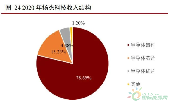 揚杰科技是老牌功率半導(dǎo)體 IDM 廠家,產(chǎn)品覆蓋廣泛。公司成立于 2006 年,2014 年在深交所上市。公司產(chǎn)品主要包括分立器件芯片、整流器件、保護器件、小信號、 MOSFET、功率模塊、SiC 等。產(chǎn)品主要應(yīng)用在電源、家電、照明、安防、網(wǎng)通、消費 電子、新能源、工控、汽車電子等多個領(lǐng)域。2020 年公司硅片、芯片和器件收入占比分 別為 4.88%、15.23%和 78.69%。