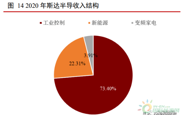 斯達半導(dǎo)是國內(nèi) IGBT 龍頭,市占率全球第七。根據(jù) IHS 報告,2019 年,斯達半 導(dǎo) IGBT 模塊市占率全球第七,是唯一進入前十的中國企業(yè)。斯達半導(dǎo)成立于 2005 年 4 月,2020 年 2 月在上交所主板上市。公司主要產(chǎn)品為 IGBT 模塊,主要用于工業(yè)控制、新能源和變頻家電領(lǐng)域。2020 年工控、新能源和變頻家電收入占比分別為 71.68%、26.14%和 1.59%。2020 年公司實 現(xiàn)收入 9.63 億元,同比+23.55%,凈利潤 1.81 億元,同比+33.30%。2020 年公司毛利率 為 31.56%,凈利率為 18.80%。
