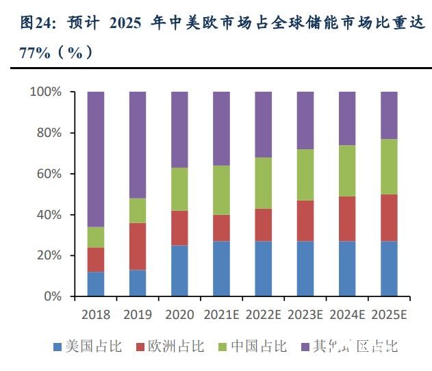 海外市場率先迸發(fā),公共項目與戶用需求共振。國內(nèi)外多國實行了多項推動、鼓勵 儲能發(fā)展的政策。2017-2021 年受益于電價定價體系、能源結(jié)構(gòu)的差異性以及政府給予 適當(dāng)補(bǔ)貼,國內(nèi)外儲能發(fā)展迅速。2020 年美國儲能市場迸發(fā),成為全球第三大儲能市場, 公共事業(yè)儲能項目集中落地,是 2021-2024 年的重要增量,同時電力供應(yīng)不穩(wěn)定刺激戶 用儲能需求,我們預(yù)計 2030 年美國新增儲能需求將達(dá) 138GW/ 441GWh。歐洲 2019 年 開啟儲能元年,2020 年再創(chuàng)新高,躍居全球累計儲能的最大市場,其中德英領(lǐng)跑,德國 是全球最大戶用儲能市場,主要是居民電價高企及補(bǔ)貼政策轉(zhuǎn)向家用儲能所致,預(yù)計 2030 年歐洲儲能需求達(dá) 131GW/394GWh。預(yù)計到 2025 年全球新增儲能裝機(jī)達(dá)到 131GW/318GWh,2021-2025 年復(fù)合增速為 79%,中國美國歐洲將是最大增量市場。
