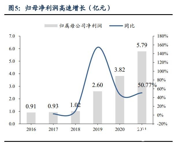 營收和凈利潤高速增長。2016-2021 年,公司營業(yè)收入 CAGR 35.0%,歸母凈利潤 CAGR 44.9%。2021 年德業(yè)股份實現(xiàn)營業(yè)收入 41.68 億,同增 37.89%,歸母凈利潤 5.79 億,同增 50.77%。主要系儲能逆變器業(yè)務(wù)增長勢頭強(qiáng)勁。