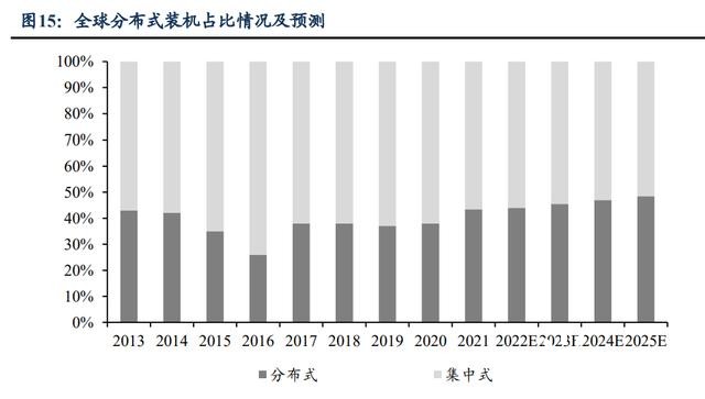 美國:加州強(qiáng)制安裝光伏系統(tǒng),分布式占比有望提升。2017-2019 年美國分布式光 伏裝機(jī)增長有所放緩,但美國加州于 2019 年出臺政策要求從 2020 年起對三層以下新建 建筑強(qiáng)制安裝光伏系統(tǒng),2021 年美國分布式光伏裝機(jī)達(dá) 6.6GW,同比增長 18%,我們 預(yù)計未來分布式光伏裝機(jī)持續(xù)快速增長,分布式占比有望提升。 歐洲:分布式占比較為穩(wěn)定,保持高速增長。歐洲分布式占比較為穩(wěn)定,2021 年約 為 59%,2021 年歐洲分布式裝機(jī)量約 15.2GW,俄烏沖突下居民電價高漲,歐洲分布式 需求旺盛,我們預(yù)計 2022 年歐洲分布式光伏將持續(xù)增長,占比或提升至 70-80%,對應(yīng) 2022 年裝機(jī)達(dá)到 35GW 以上,實現(xiàn)翻倍多增長。