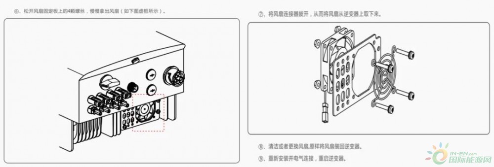 如果逆變器顯示“風(fēng)扇異常”或“過溫保護”等信息,需現(xiàn)場檢查逆變器散熱風(fēng)扇是否運行,或有異物卡死,可嘗試清理異物、撥動風(fēng)扇,若風(fēng)扇仍然不運行,請聯(lián)系錦浪科技售后進行處理。