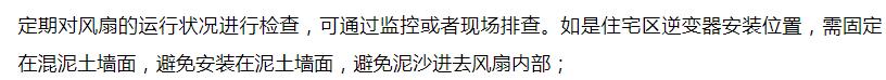 要保障逆變器散熱風(fēng)扇正常運行,前期合理的安裝和后期排查運維必不可少,首先需要避免有異物積累的安裝環(huán)境或者添加保護機制,并定期通過監(jiān)控和現(xiàn)場排查及時清理和更換風(fēng)扇,以保障逆變器正常運行。