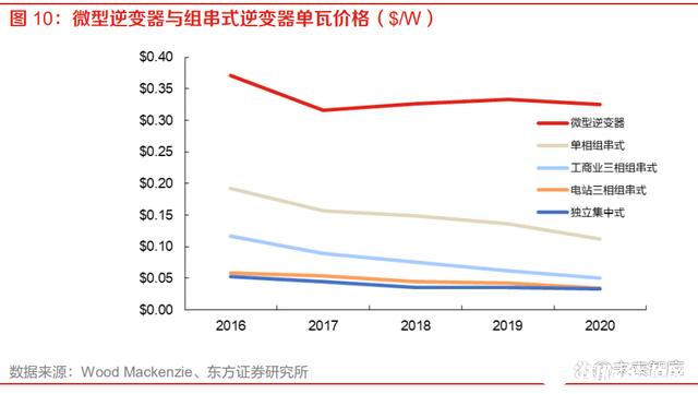 產(chǎn)品定位光伏中小功率段的應(yīng)用場(chǎng)景,適配價(jià)格敏感度相對(duì)不高、更注重應(yīng)用屬性與品牌的地區(qū)。 微型逆變器應(yīng)用顆粒度相較當(dāng)前市場(chǎng)主流組串式逆變器或集中式逆變器方案而言較細(xì),在相對(duì)小 功率分布式應(yīng)用場(chǎng)景在安全性、發(fā)電效率、可靠性以及靈活性等方面存在優(yōu)勢(shì);但同樣式因?yàn)槠?較細(xì)的顆粒度,導(dǎo)致其歷史維度上單瓦價(jià)格處于較高位置。