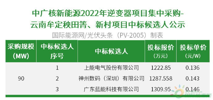 國際能源網(wǎng)/光伏頭條(PV-2005)獲悉,12月22日,中廣核新能源2022年逆變器項(xiàng)目集中采購-云南牟定秧田箐、新村項(xiàng)目中標(biāo)候選人公示。上能電氣股份有限公司、神州數(shù)碼(深圳)有限公司、廣東藍(lán)能科技有限公司3家企業(yè)入圍。