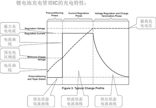 有上圖可以看出,鋰電池充電電流和電壓是動態(tài)變化的,這是由鋰電池本身的化學(xué)物質(zhì)決定的。所以需要根據(jù)鋰電池本身的充電特性來配置充電IC的性能,以達到正確,安全,高效的使用鋰電池。日常表述中的“鋰電池充電電流”是針對鋰電池在充電過程中所處快速充電階段的充電電流而言的,作為一個動態(tài)的過程,鋰電池最理想充電電流實際上是分為三個階段的。常用鋰電池充電IC如TP4012A、TP8052、TP8056,本文最后處有部分介紹。