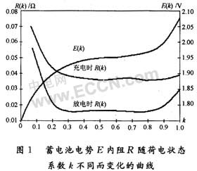 蓄電池的電勢(shì)E、內(nèi)阻Ri與電池的荷電狀態(tài)有關(guān)。荷電以系數(shù)k表示,其值在0~1之間,0代表未荷電,1代表滿荷電。隨荷電系數(shù)k由0上升,蓄電池電勢(shì)非線性地增大,內(nèi)阻Ri則呈現(xiàn)先下降最后又略有升高的形狀,如圖1所示。由圖1可見(jiàn),蓄電池內(nèi)阻Ri的充、放電曲線亦有差別。起動(dòng)機(jī)每起動(dòng)一次,荷電狀態(tài)系數(shù)k均會(huì)下降百分之幾,變化量很?。欢铍姵仉妱?shì)E(k)的變化則視k之值而異。當(dāng)k在0.3~0.85范圍內(nèi)時(shí),起動(dòng)機(jī)每起動(dòng)一次E(k) 變化很小,接近恒值,但當(dāng)k>0.85和k<0.3時(shí),隨k值的小變化,E(k)變化較為明顯。在設(shè)計(jì)蓄電池模擬電源控制軟件時(shí)應(yīng)予以考慮。