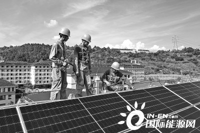 圖為國(guó)網(wǎng)嵊州市供電公司工作人員在嵊州市高級(jí)中學(xué)屋頂安裝輕質(zhì)柔性太陽(yáng)能光伏板。